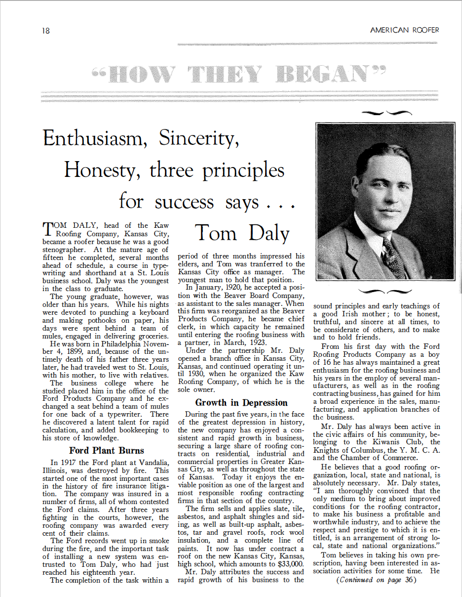 This Article was originally published in the April 1936 issue of American Roofer Magazine in the Article section "How they Began". Tom Daly was a founding member of the MRCA. KAW Roofing & Sheet Metal has been in the Roofing Industry for more than 90 years and four generations. For more information about KAW Roofing & Sheet Metal visit them at www.kawroofandmetal.com To see the Original Article follow this link: American Roofer Tom Daly